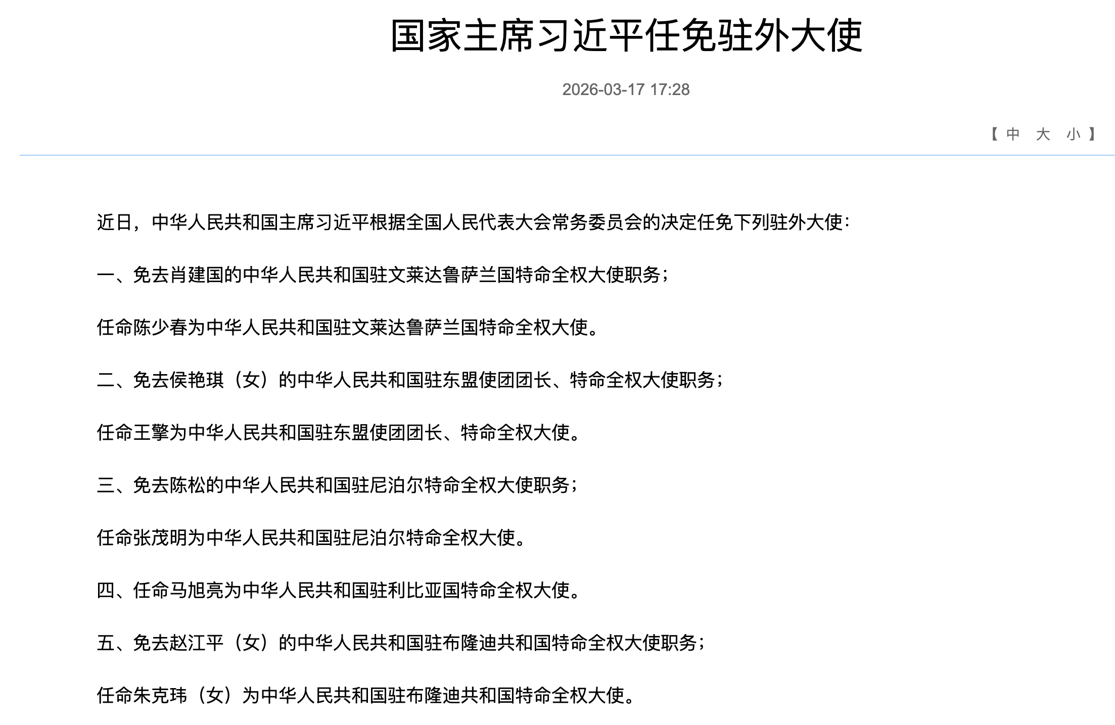 La phase 国家主席习近平任免驻外大使。Guójiā Zhǔxí Xí Jìnpíng rènmiǎn zhùwài dàshǐ.